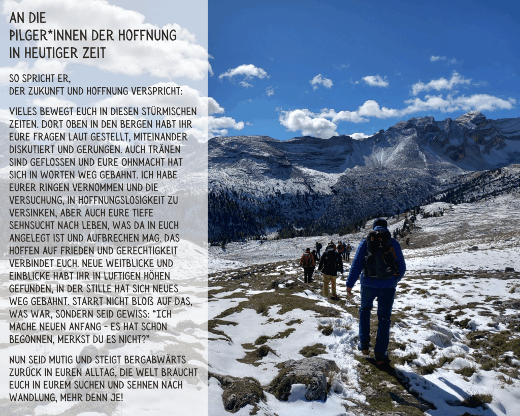 So klingt es ein letztes Mal für dieses Jahr am Ende einer langen Bergsaison. Ganze vier volle Wochen Bergglückdraußenzeit waren mir in diesem Sommer geschenkt – und mein Herz klopft. Und der Lockenkopf rauscht. Und auch das Knie feiert noch einmal regenbogenfarbenhaft die Bergwelt, so von hellgelb bis dunkellila. Volltrefferhafte Premierenfeier. Nun ja, irgendwann ist ja immer mal das erste Mal. Aber egal, ist ja schließlich Herbst. Es war mir eine Freude, noch einmal mit anderen Pilger*innen der Hoffnung hinaufzuziehen in luftige Höhen, mit den Füßen Abstand vom Alltag und dieser turbulenten Welt zu suchen, Tal- und Weltnachrichten für einige Tage auszuschalten und sich gemeinsam auf Hoffnungsspurensuche zu begeben – in der großen weiten und in der kleinen nahen Welt. Neben dem ersten Schnee haben uns viele Fragen in diesen Tagen begleitet, wir haben miteinander um Antworten gerungen, gelacht und geweint, das Leben gefeiert und so vieles aus dem atemberaubenden Bergpanorama mitgeHOLT, dass uns manches Mal fast schwindlig dabei wurde. Aber nur fast. So lade ich euch ein, noch einmal mit mir auf Bergpilgerschaft zu gehen und weite Aus- und Einsichten zu genießen – viel Freude dabei! Du möchtest die komplette Ausgabe der lebens.verbunden-Post lesen? Dann kannst Du Dich hier dazu anmelden.